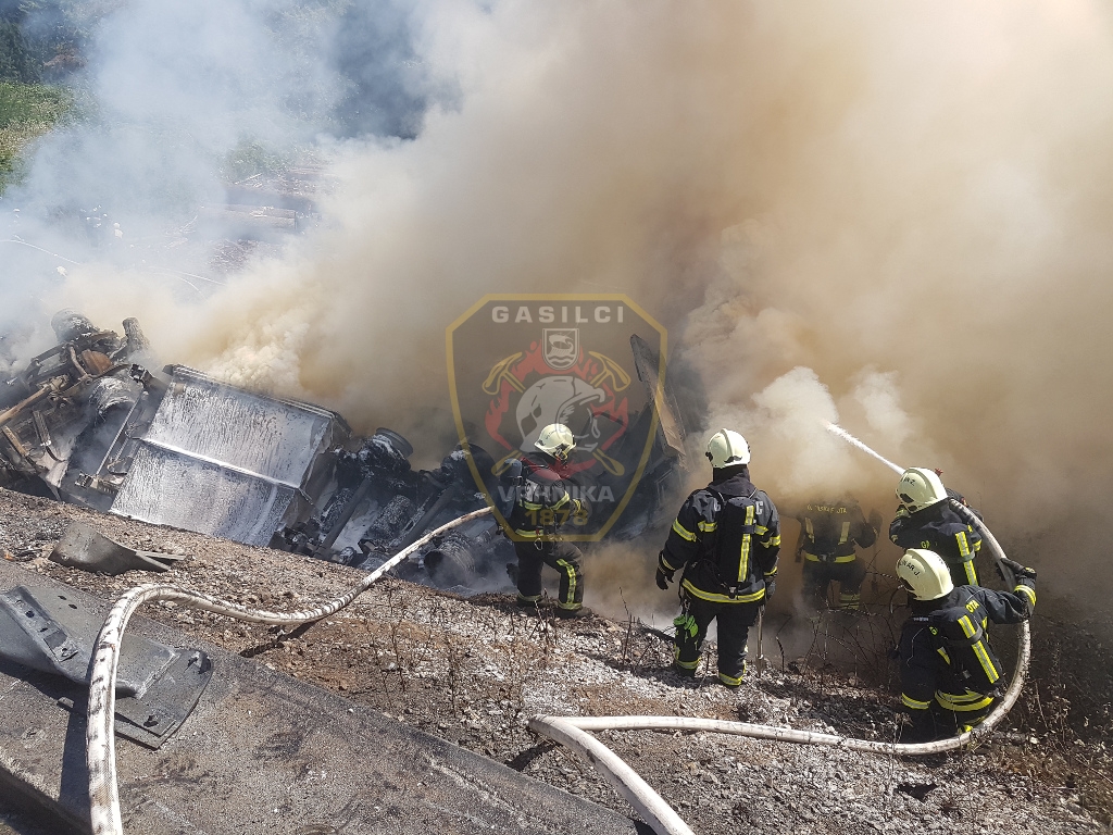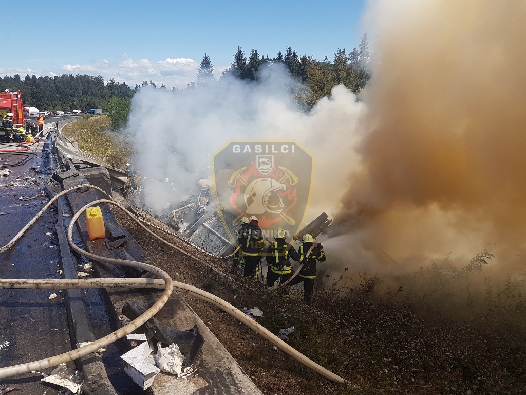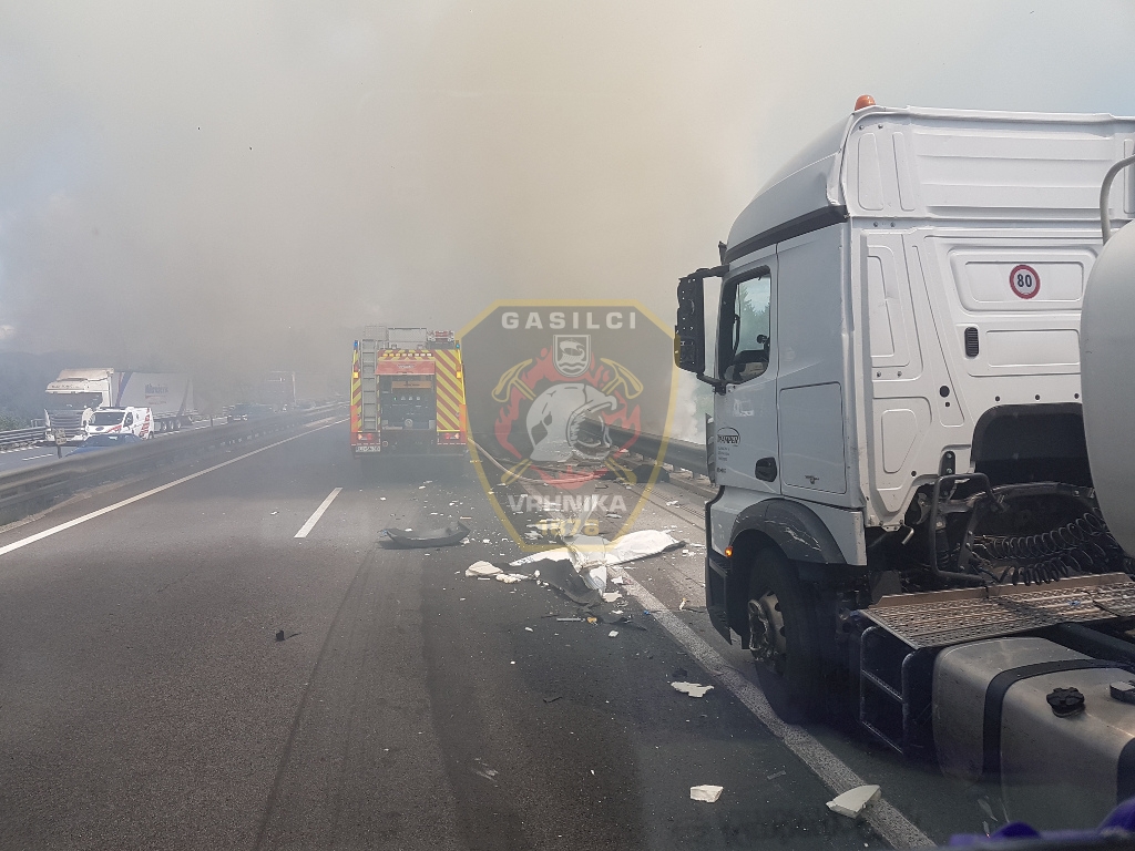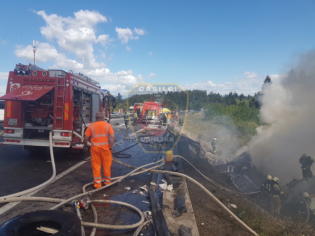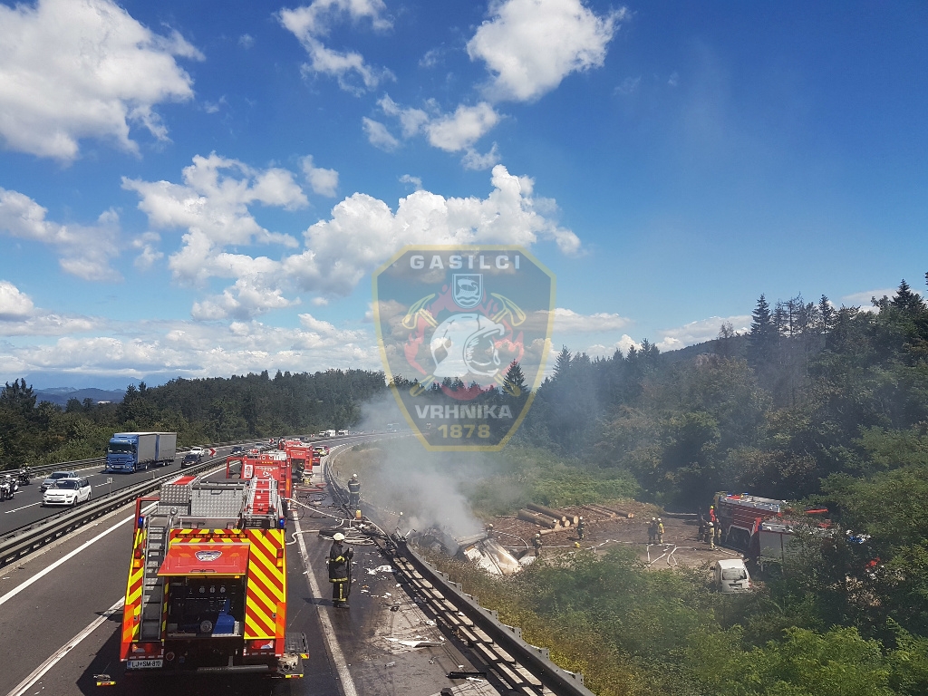 Ob 12.02 je na primorski avtocesti med Logatcem in Vrhniko tovornemu vozilu za prevoz nevarnih tekočin razneslo pnevmatiko, zaradi česar je prišlo do naleta drugega tovornega vozila, ki je nato prebilo varovalno ograjo, obstalo ob podvozu nižje ležeče lokalne ceste in se vnelo. Gasilci GB Ljubljana, PGD Verd, Vrhnika in Dolnji Logatec so zavarovali mesto nesreče, pogasili goreče tovorno vozilo, s tehničnim posegom iz razbitin rešili preminulo osebo, s pivniki in črevesi omejili razlivanje nevarnih tekočin izven mesta nesreče, zagotavljali požarno varovanje med pretakanjem goriva iz poškodovane avtocisterne ter nudili pomoč avtovleki in cestnemu podjetju pri čiščenju posledic prometne nesreče s cestišča. Na mestu nesreče so posredovali tudi reševalci NMP Vrhnika, NMP RP Ljubljana, NMP Logatec in policisti.